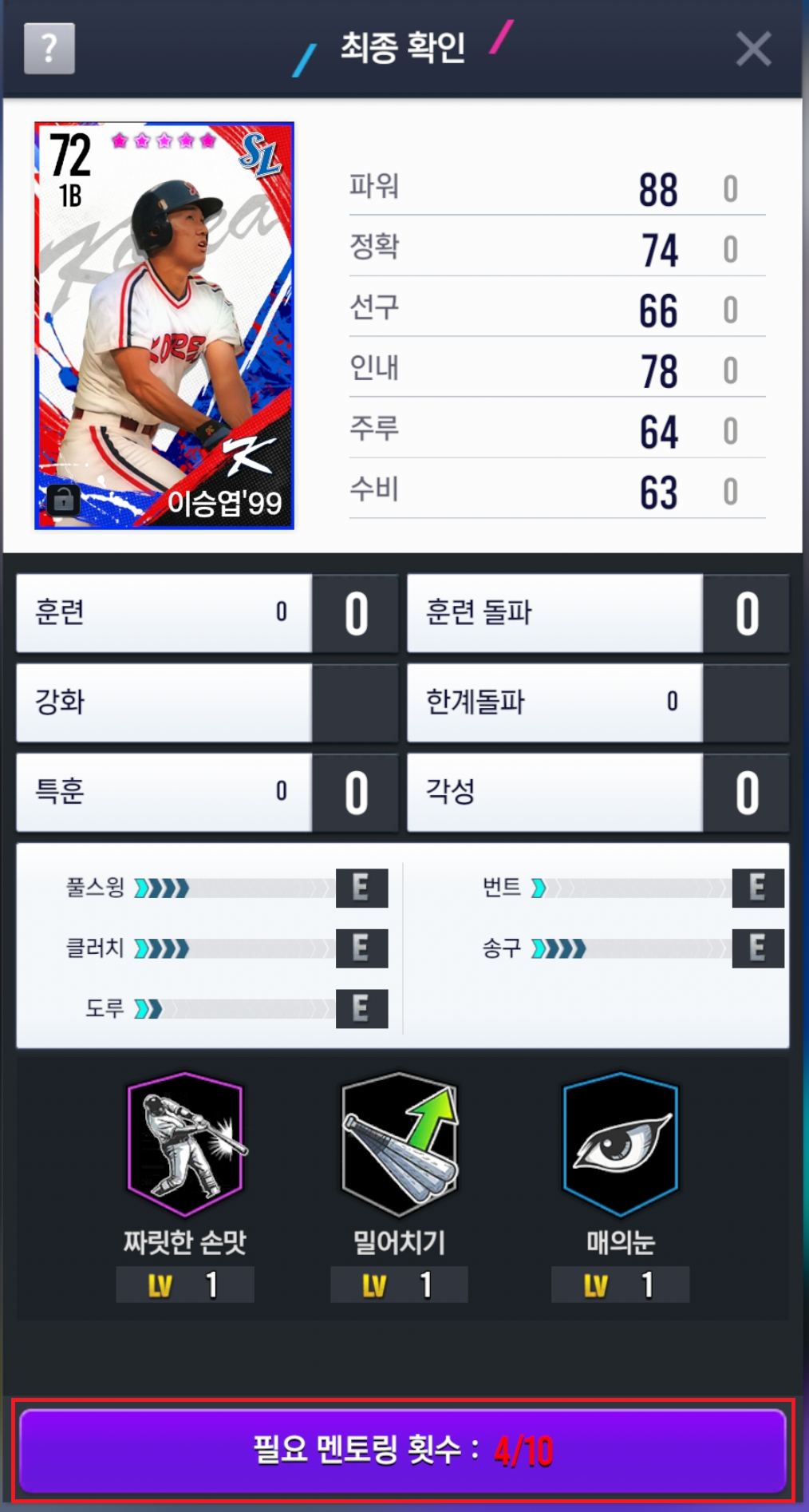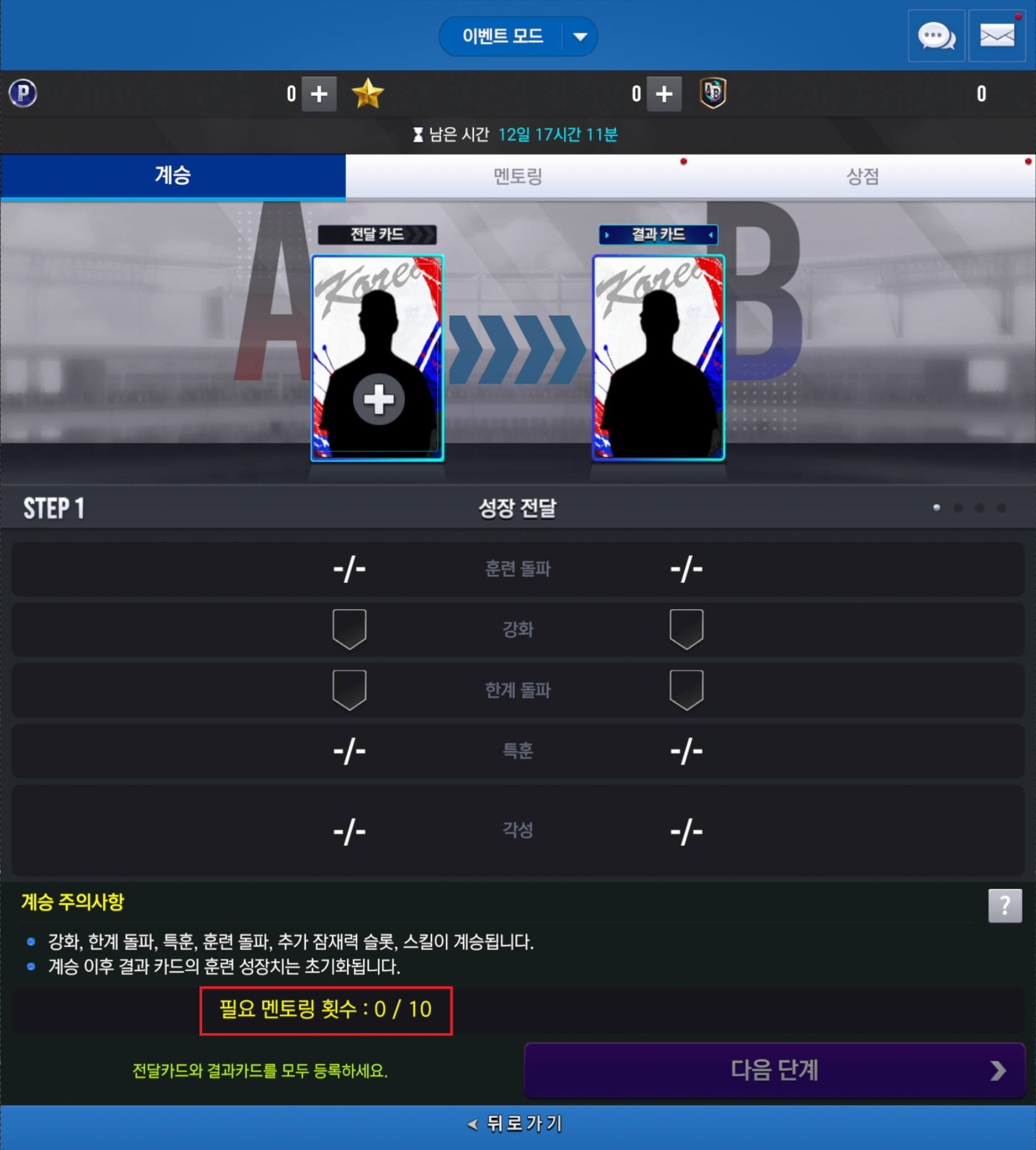 일정 횟수의 멘토링을 진행하면 동일 투타 유형. 동일 팀의 국가대표 카드끼리 계승을 진행할 수 있는