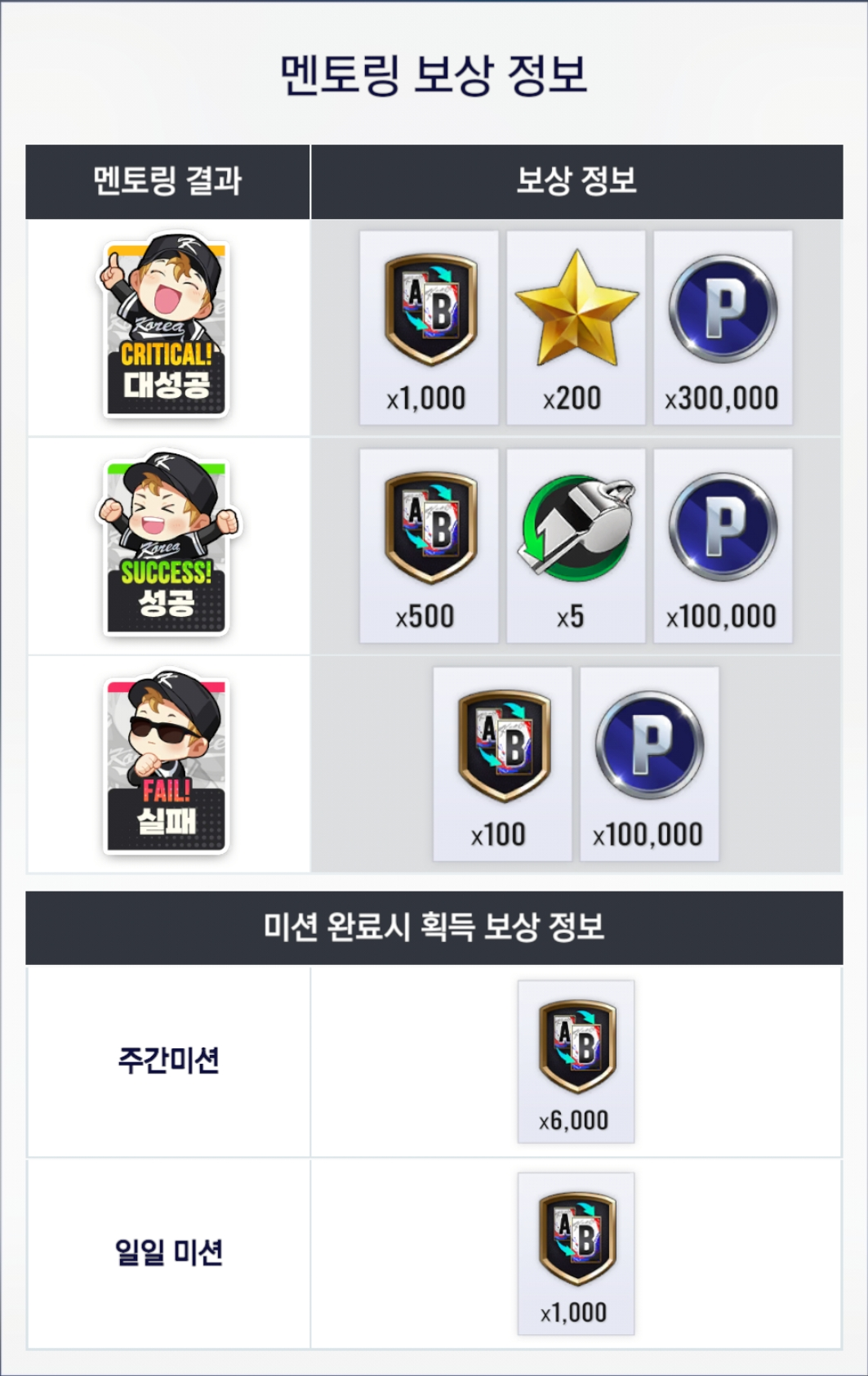 - 멘토링 진행 시 확률에 따라 대성공/성공/실패가 결정되며, 결과에 따른 보상과 [국가대표 멘토링 토큰]을 획득합니다.