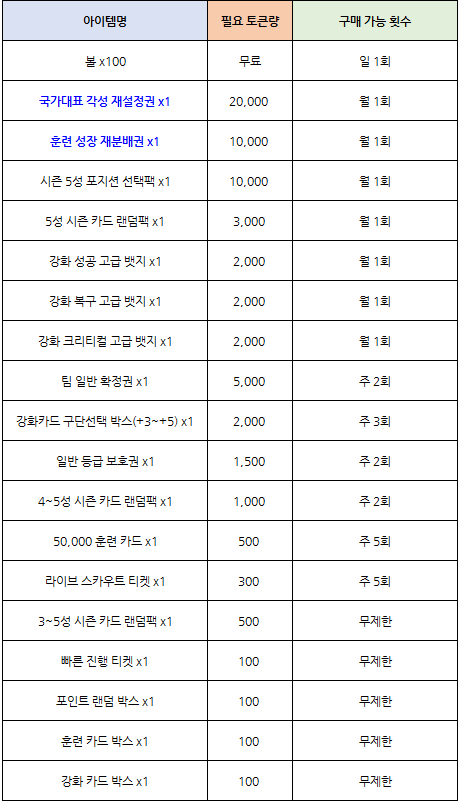 - 획득한 [국가대표 멘토링 토큰]으로 국가대표 각성 재설정권, 훈련 성장 재분배권 등 다양한 아이템을 획득할 수 있습니다.