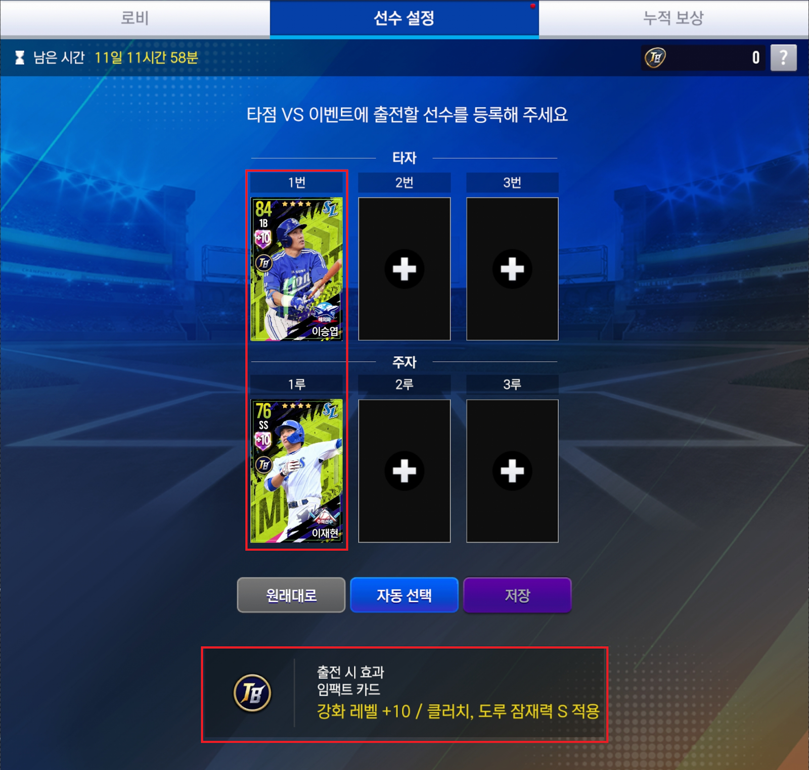 해당 종류의 선수 카드로 타자와 주자로 배치하시면 조금 더 원활하게 이벤트를 이용하실 수 있습니다.