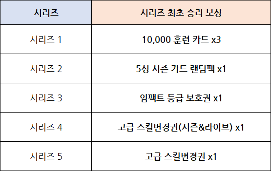 - 각 시리즈를 최초 승리 시 최초 승리 보상을 획득 하실 수 있습니다.