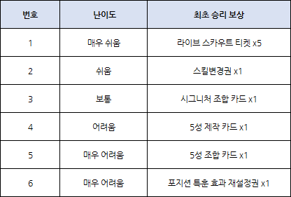 - 상위 난이도 경기는 이전 난이도를 승리한 상태라면 인게임에 기재된 날짜부터 이용이 가능합니다.