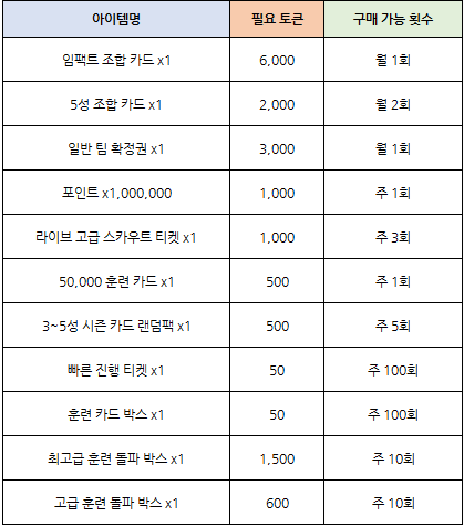 임팩트 조합 카드, 시그니처 조합 카드, 5성 조합 카드, 라이브 스카우트 티켓 등