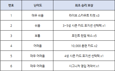 - 상위 난이도 경기는 이전 난이도를 승리한 상태라면 인게임에 기재된 날짜부터 이용이 가능합니다.