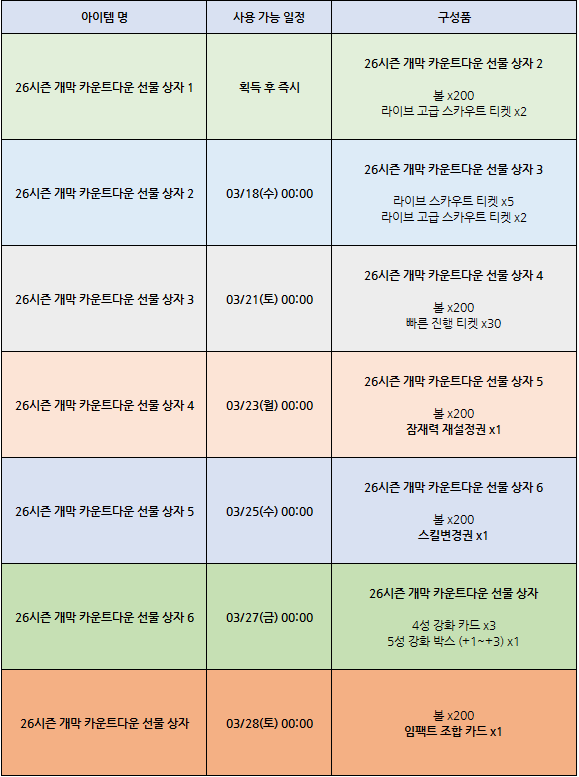 - 26시즌 개막 카운트다운 선물 상자들은 04/04(토) 00:00 까지 사용할 수 있으며, 사용하지 않은 선물 상자는 기간 경과 이후 소멸됩니다.