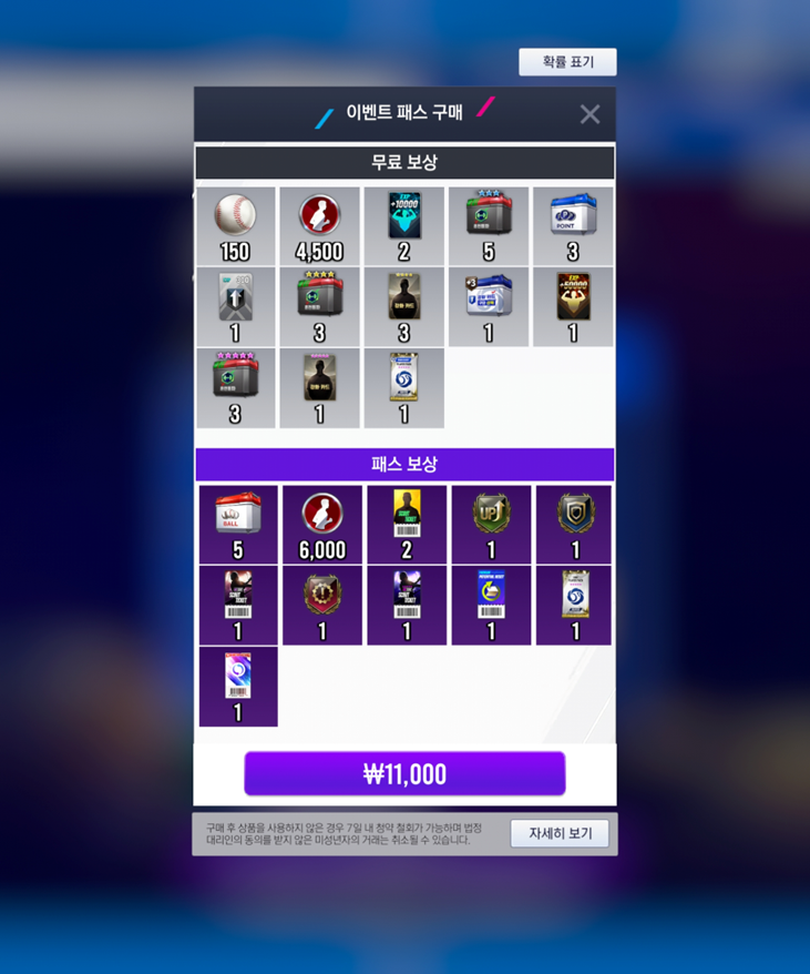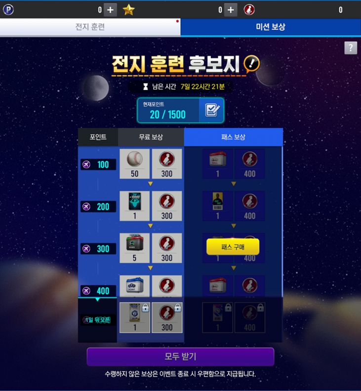 - 패스를 구매 시, 이전에 달성한 패스 포인트에 해당하는 패스 보상도 모두 수령 가능합니다.