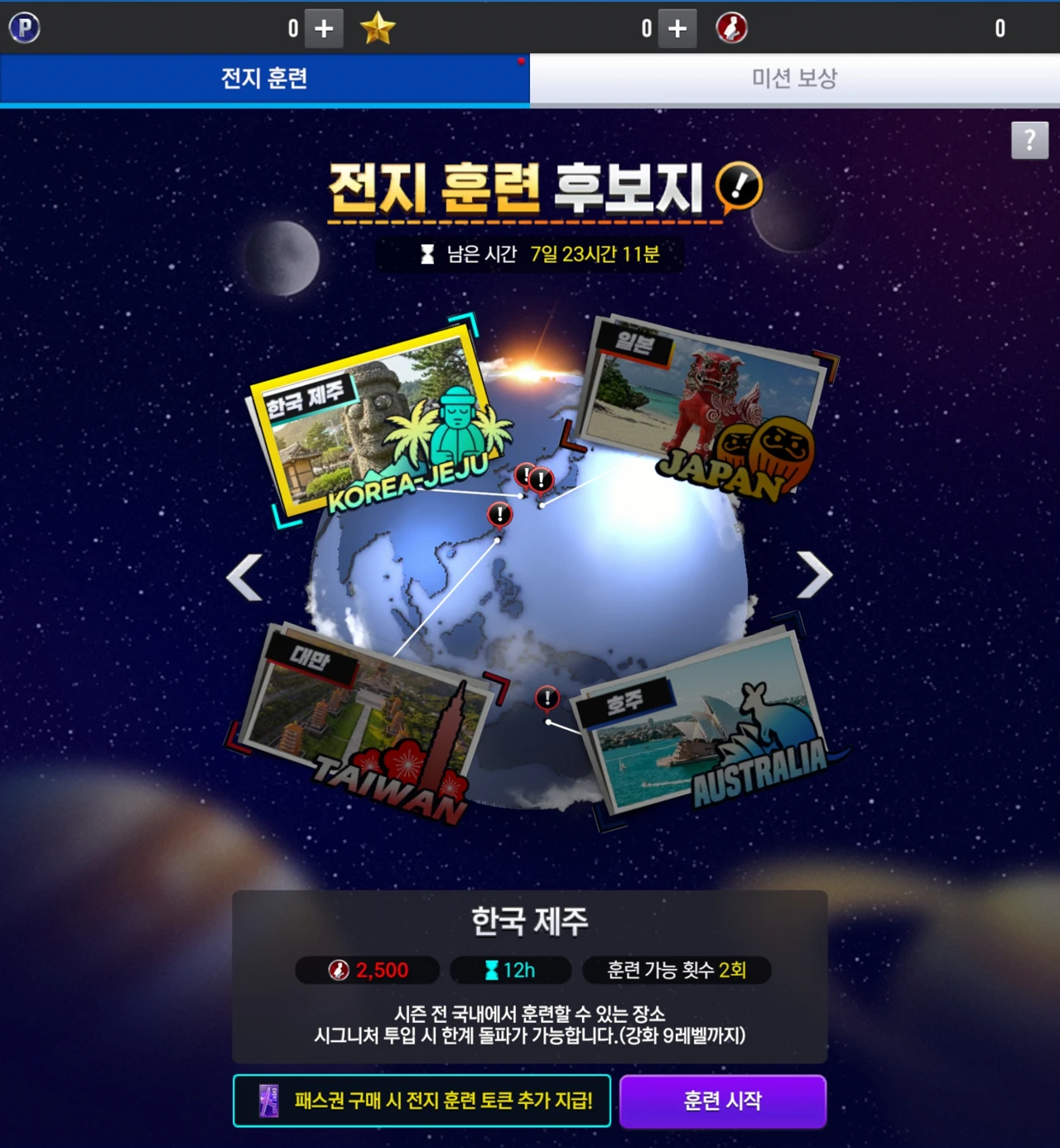 - 필요한 성장에 맞는 전지 훈련 장소를 선택하고 미션을 통해 획득한 [전지 훈련 토큰]을 소모하여,