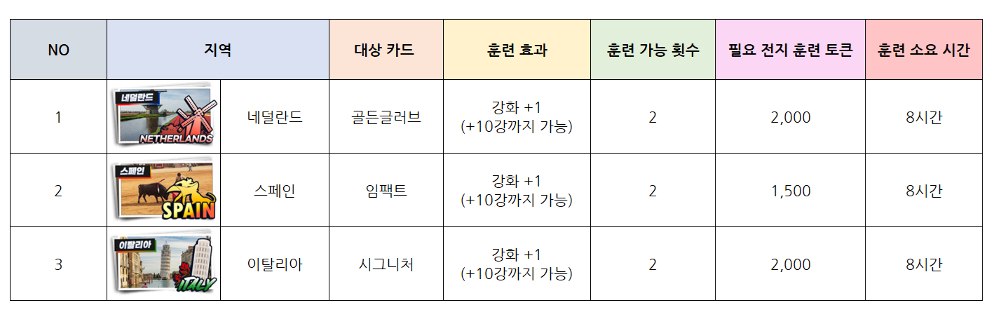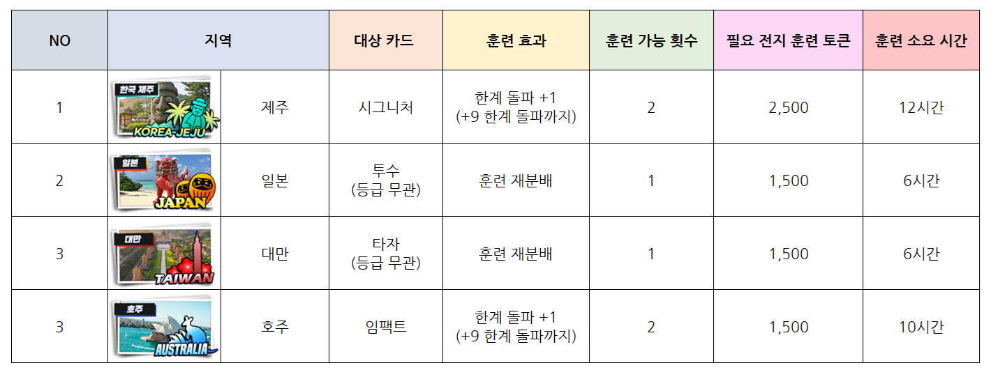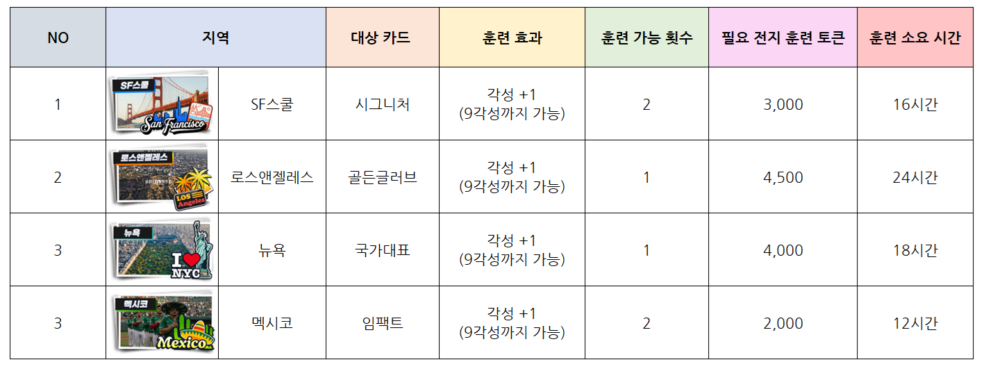 - 전지 훈련 장소에 따라 가능한 성장 콘텐츠가 다르며 콘텐츠 및 카드 종류에 따라 소모되는 토큰량, 시간, 이용 횟수가 달라집니다.