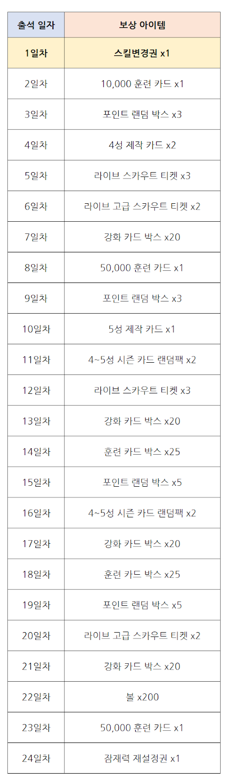 ※ 이벤트 기간 동안 24일 출석 시 모든 선물을 획득할 수 있습니다.