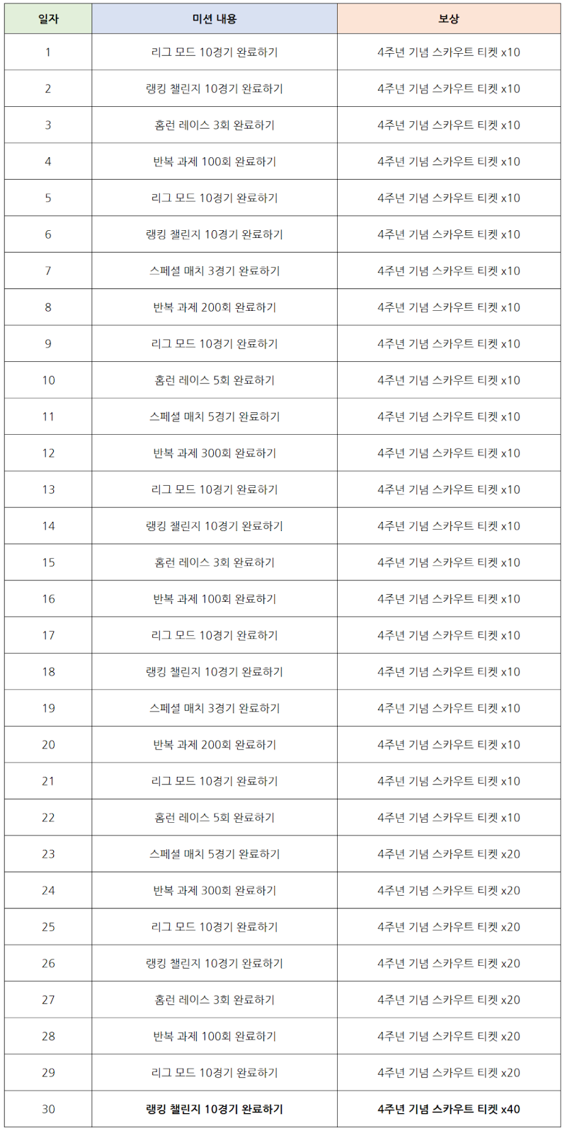 - 매일 주어지는 이벤트 미션을 수행하면 [4주년 기념 스카우트 티켓]을 획득하실 수 있으며, 최대 400장까지 획득하실 수 있습니다.