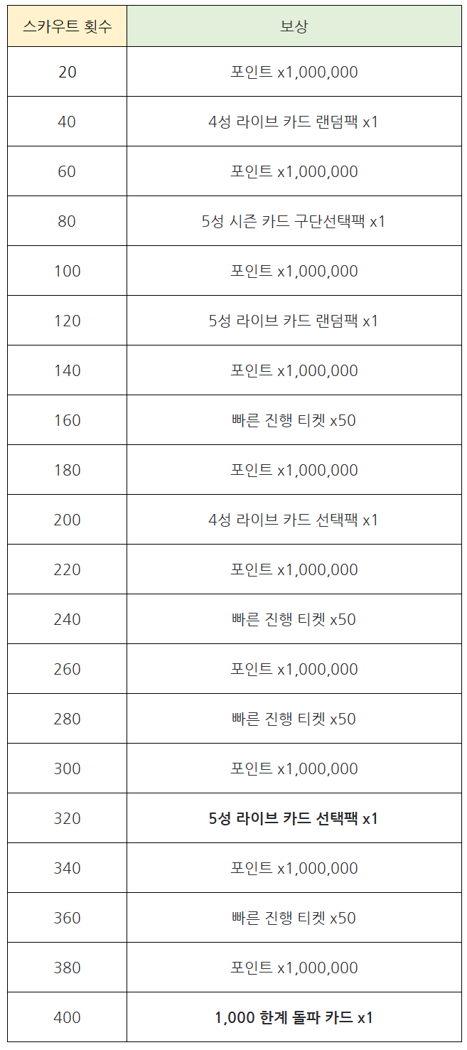- 런칭 4주년 기념 스카우트 횟수에 따라 5성 라이브 카드 선택팩을 비롯하여 다양한 보상을 획득하실 수 있습니다.