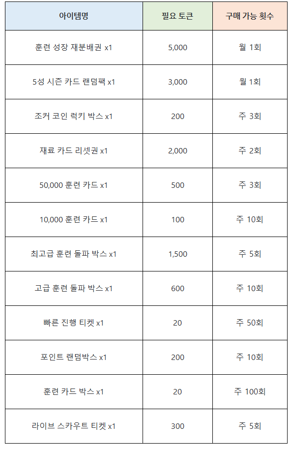 - 획득한 이벤트 토큰을 이벤트 상점에서 사용하여 다양한 보상을 획득할 수 있습니다.