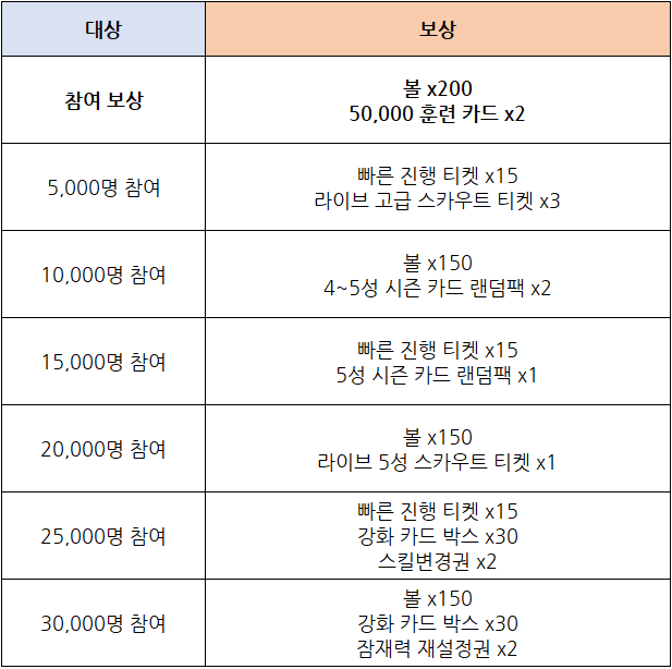 참여하신 모든 구단주님께는 참여 보상과 인원 달성 보상을 드리며,