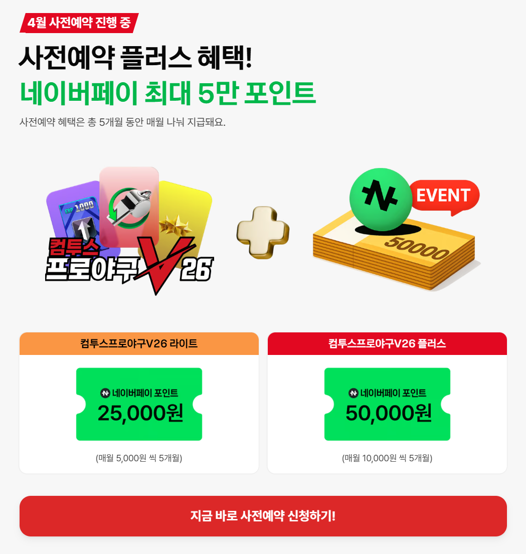 : 컴투스프로야구V26 플러스 요금제 사전예약 후 개통 시 네이버포인트 5만원 지급
