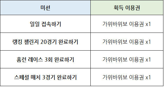 - 매일 4개 이벤트 미션을 달성할 때마다 가위바위보 이용권을 하루 최대 4회까지 획득할 수 있으며