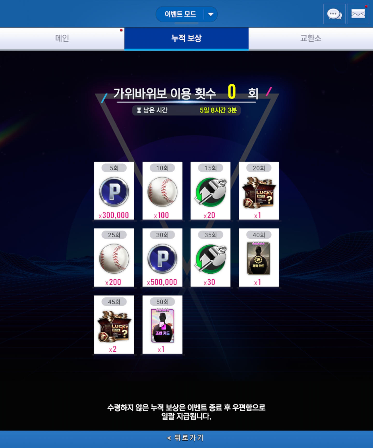 - 수령하지 않은 누적 이용 횟수 보상은 이벤트 기간 경과 시, 우편함으로 자동 지급됩니다.