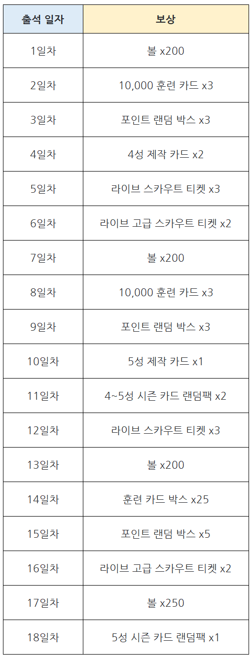 ※ 이벤트 기간 동안 18일 출석 시, 모든 선물을 획득할 수 있습니다.