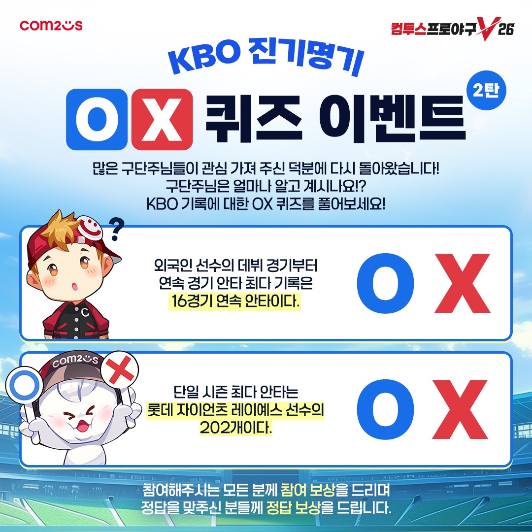이상으로 KBO 진기명기 OX 퀴즈 2탄 이벤트 안내를 마치겠습니다.