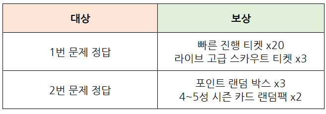 ※ EX) 1번 항목 정답, 2번 항목 오답 시 빠른 진행 티켓x2, 라이브 고급 스카우트 티켓 x3만 획득하실 수 있습니다.