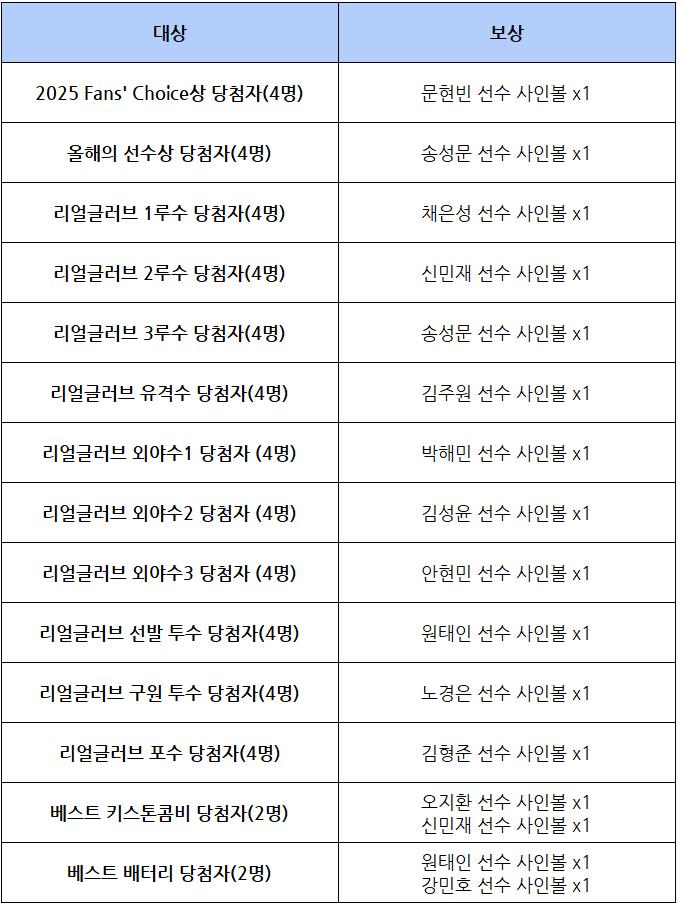 [당첨 안내] 2025 리얼글러브 수상자 예측& Fans' Choice 이벤트 당첨자 안내