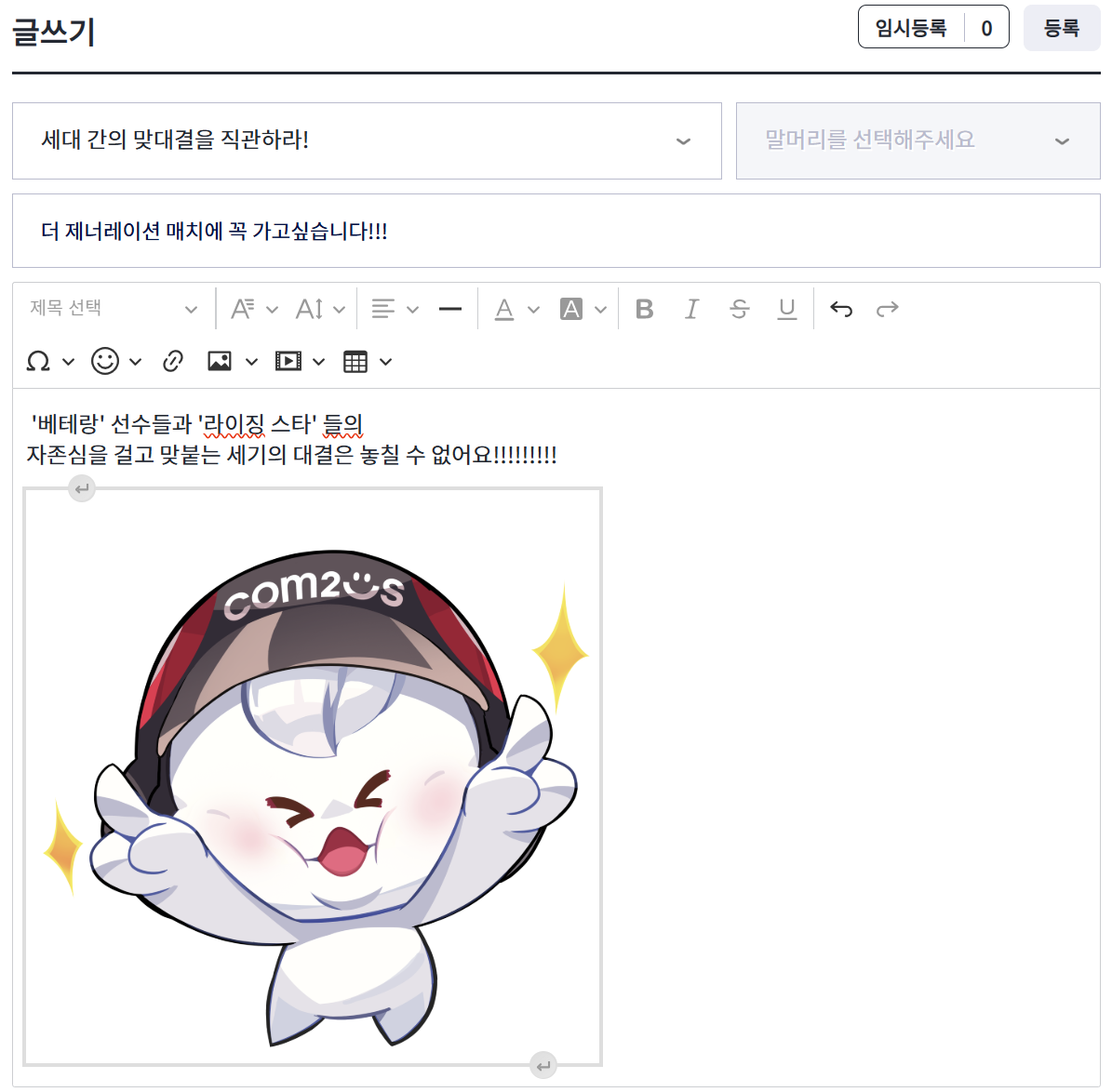 3. 제목을 입력 후 내용에 본인 구단 소개 및 자랑과 더 제너레이션 매치에 가야되는 이유를 작성해주세요!