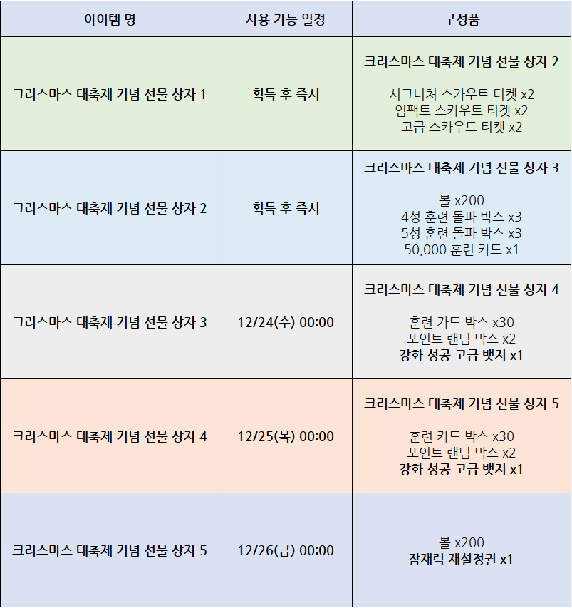 - 이후 크리스마스에 추가 사용하여 강화 성공 고급 뱃지, 잠재력 재설정권 등의 보상을 획득 하실 수 있습니다!
