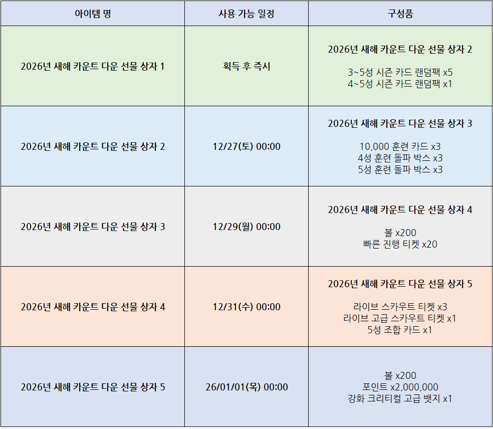 - 2026년 새해 카운트 다운 선물 상자 1 ~5는 26/01/19(월) 00:00 까지 사용할 수 있으며, 사용하지 않은 선물 상자는 기간 경과 이후 소멸됩니다.