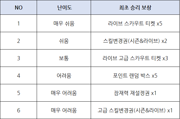 - 상위 난이도 경기는 이전 난이도 승리한 상태라면 인게임에 기재된 날짜부터 이용이 가능합니다.