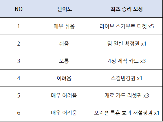 - 상위 난이도 경기는 이전 난이도 승리한 상태라면 인게임에 기재된 날짜부터 이용이 가능합니다.