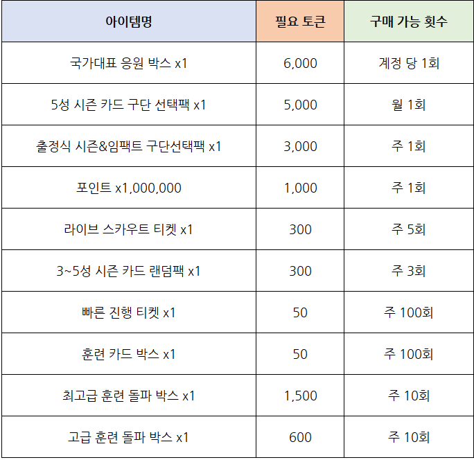 - 국가대표 스페셜 매치에서 획득한 이벤트 토큰을 통하여 이벤트 상점에서 각종 보상을 구매하실 수 있습니다.