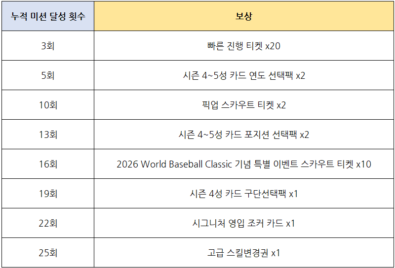 고급 스킬변경권, 시그니처 영입 조커 카드, 2026 World Baseball Classic 기념 특별 이벤트 스카우트 티켓까지 획득할 수 있습니다.
