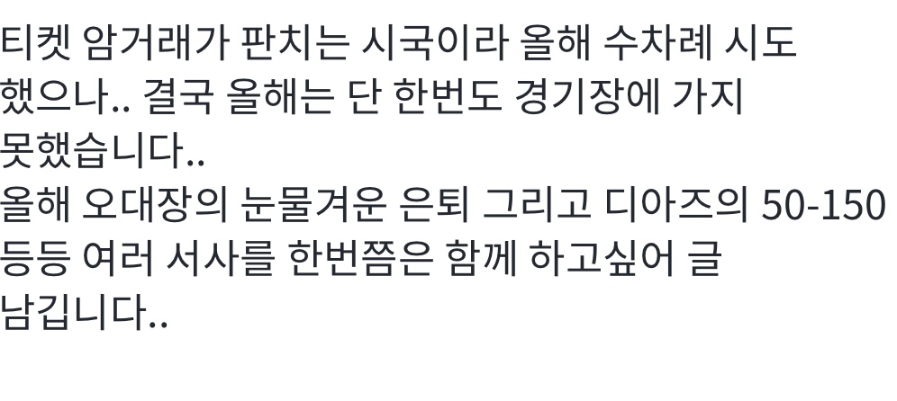 [사연은 평범하지만 직관은 가고 싶어!] 삼성 팬으로써 ㅜㅜ 국대I선발원태인 2025-10-03 00:47 8 0 공유 공유 URL 복사 페이스북 왓츠앱 카카오톡 라인 레딧 닫기 공유 아래 글에 어떤 들어가면 안되는 단어가 있는지.. 0 0 댓글 0