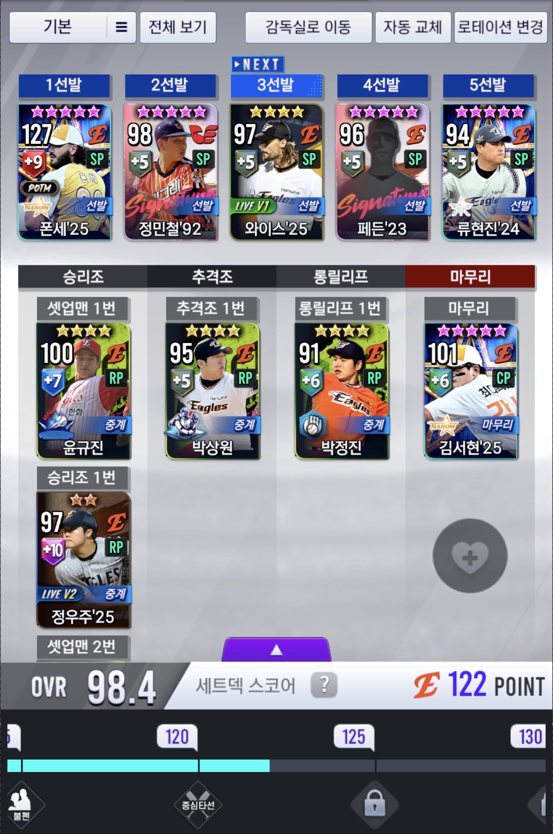 특히 내가 만든 라인업에서 노시환, 김태균, 송지만, 정근우 같은 한화의 전설적인 선수들이 타석에 설 때면, 진짜 심장이 쿵쾅거린다.