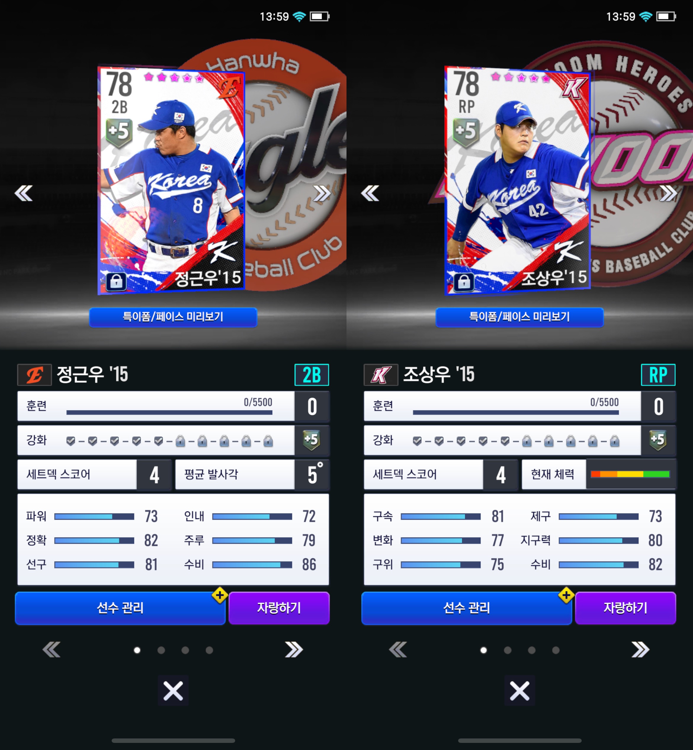컴투스프로야구V25에는 국가대표 팀에 선발되어 국제대회에 참여한 선수들을 국가대표 카드로 사용할 수 있게 제공하고 있습니다. 일반 시즌 카드에 비해 높은 능력치, 국가대표 카드 전용 스킬 등과 함께 좋아하는 선수가 국가대표로 활약했을 당시의 유니폼을 입은 미니 페이스온도 매력적이라 개인적으로는 국가대표 카드를 매우 좋아하고, 다양한 국가대표 카드를 보유하고 있습니다.