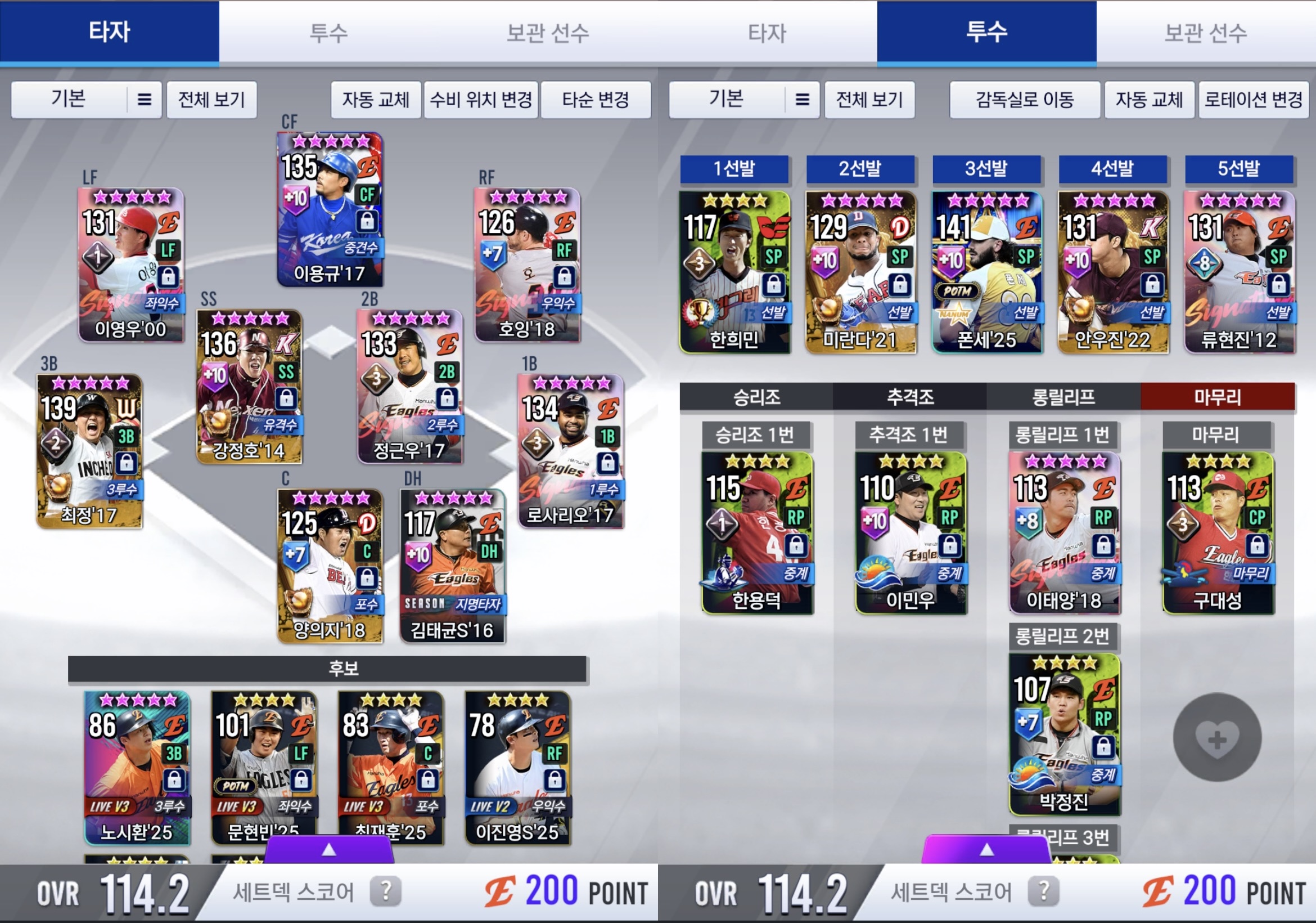 위 사진은 현재 제 컴투스프로야구V25 덱인데, 오랫동안 국가대표에서 테이블세터로 활약하였고 또 한화이글스에서도 테이블세터로 수년간 활약했었던 이용규 선수의 국가대표 카드를 제 팀에서 리드오프로 기용하고 있습니다.