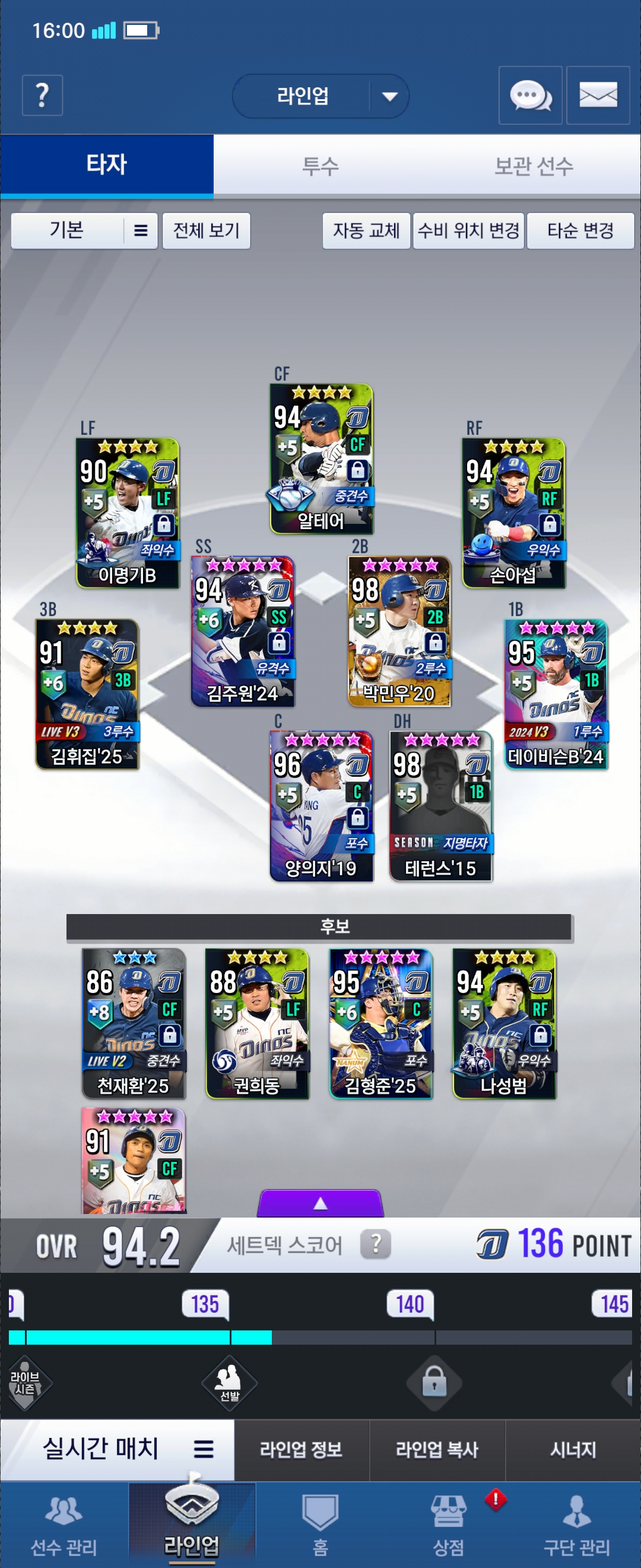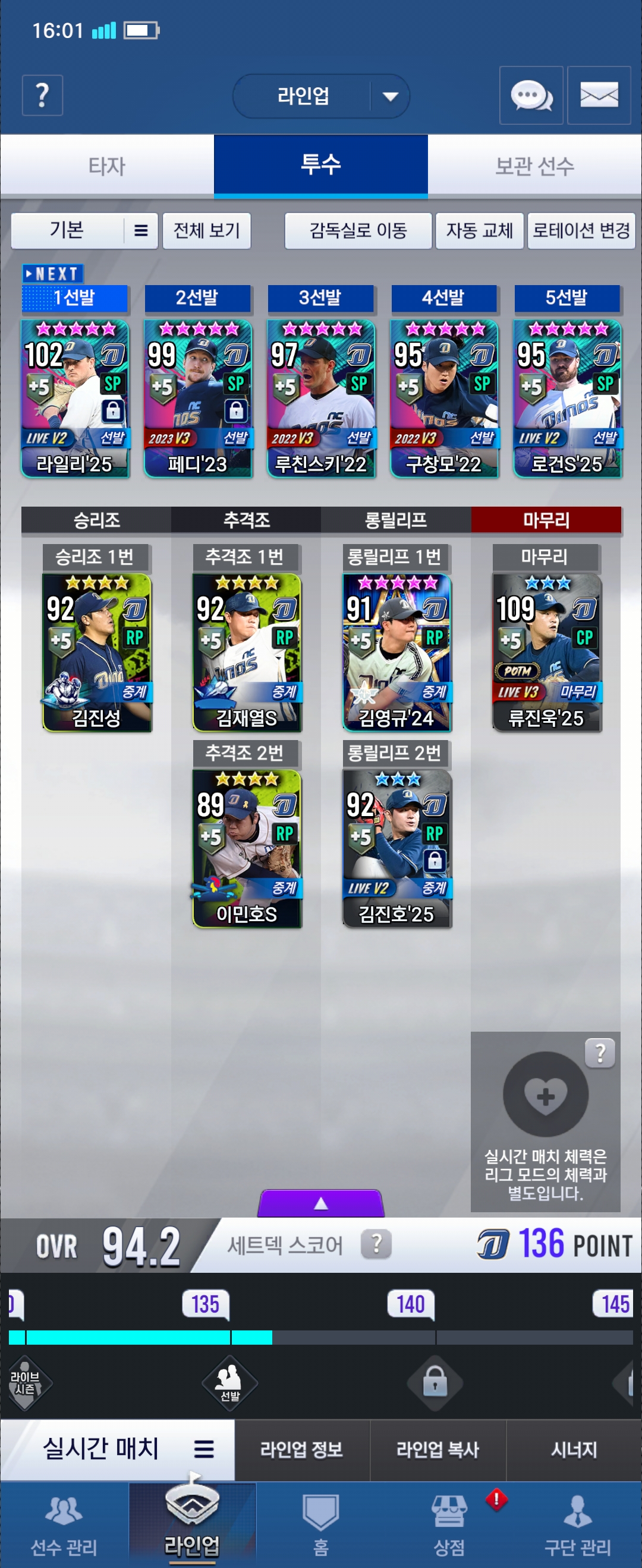 이제 (갑작스럽지만) 컴프야V25에 대해 얘기해 보겠습니다. 사진 1은 제 야수진 입니다. 리그 모드에서는 이명기B 선수가 제일 BEST이고요,실시간 매치에서는 양의지 선수,김주원 선수,알테어 선수가 BEST입니다. 사진 2는 제 투수진 입니다. 예전에는 불펜에 배제환 선수,김시훈 선수 등 3성선수가 많았지만 지금은 임팩트 카드,올스타 카드로 3성 카드는 롤릴리프 김진호 선수와 마무리 류진욱 선수만 있네요.
