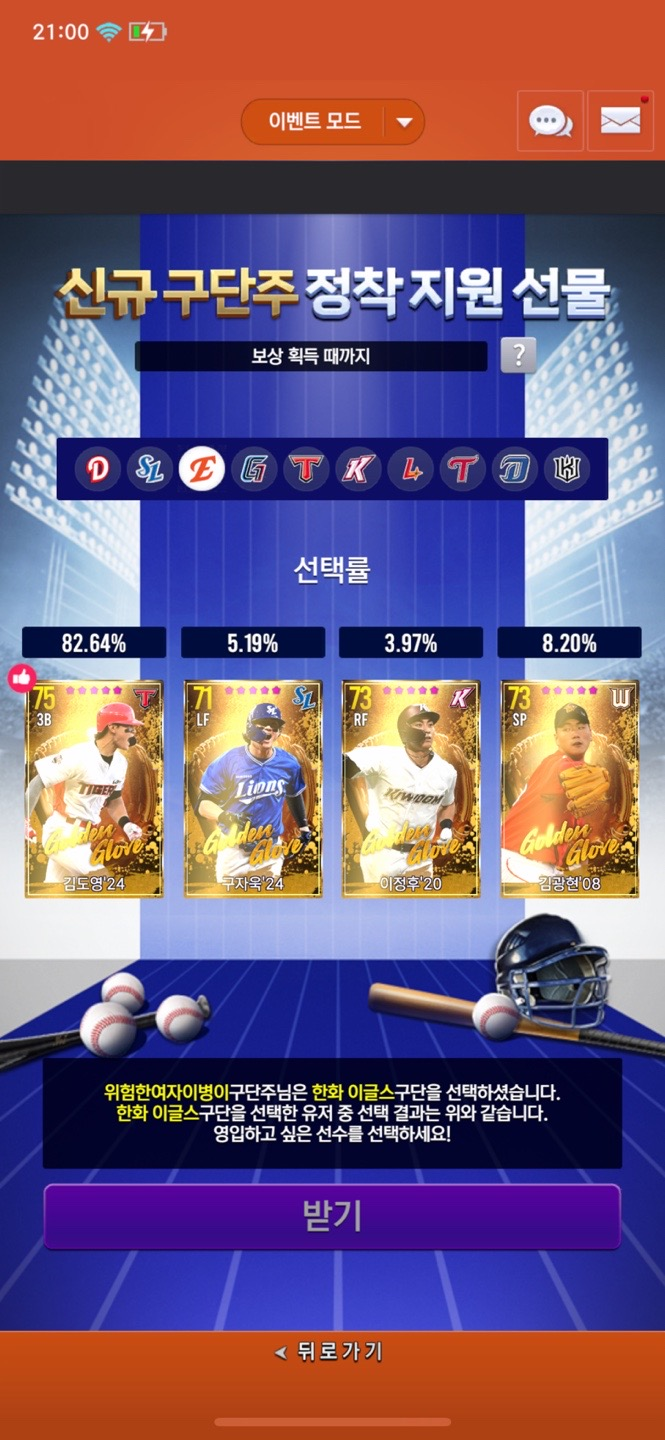 선수들의 야구 구종들도 자연스럽게 공부가 되는 것 같아 야구를 좋아하는 입장에서 너무너무 좋은 게임인 것 같아 요즘 둘이 게임하기도 합니다. 전 가능한 모든 포지션을 한화이글스 소속 선수들로 채우고 싶고 더 공부해서 전략적인 게임이 가능하도록 레벨업시키고 있습니다.
