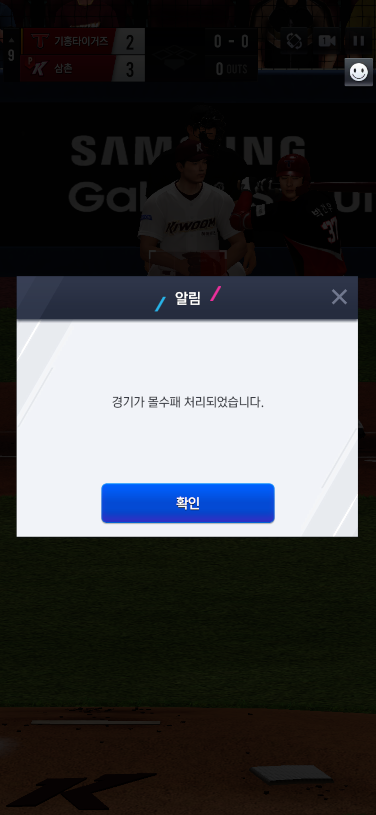 발생 상황은 9회초 이닝 시작 마무리 투수 올린 직후, 상대방의 준비가 0초까지 이뤄지지 않고 1분간 대기하다 해당 창이 떴습니다.