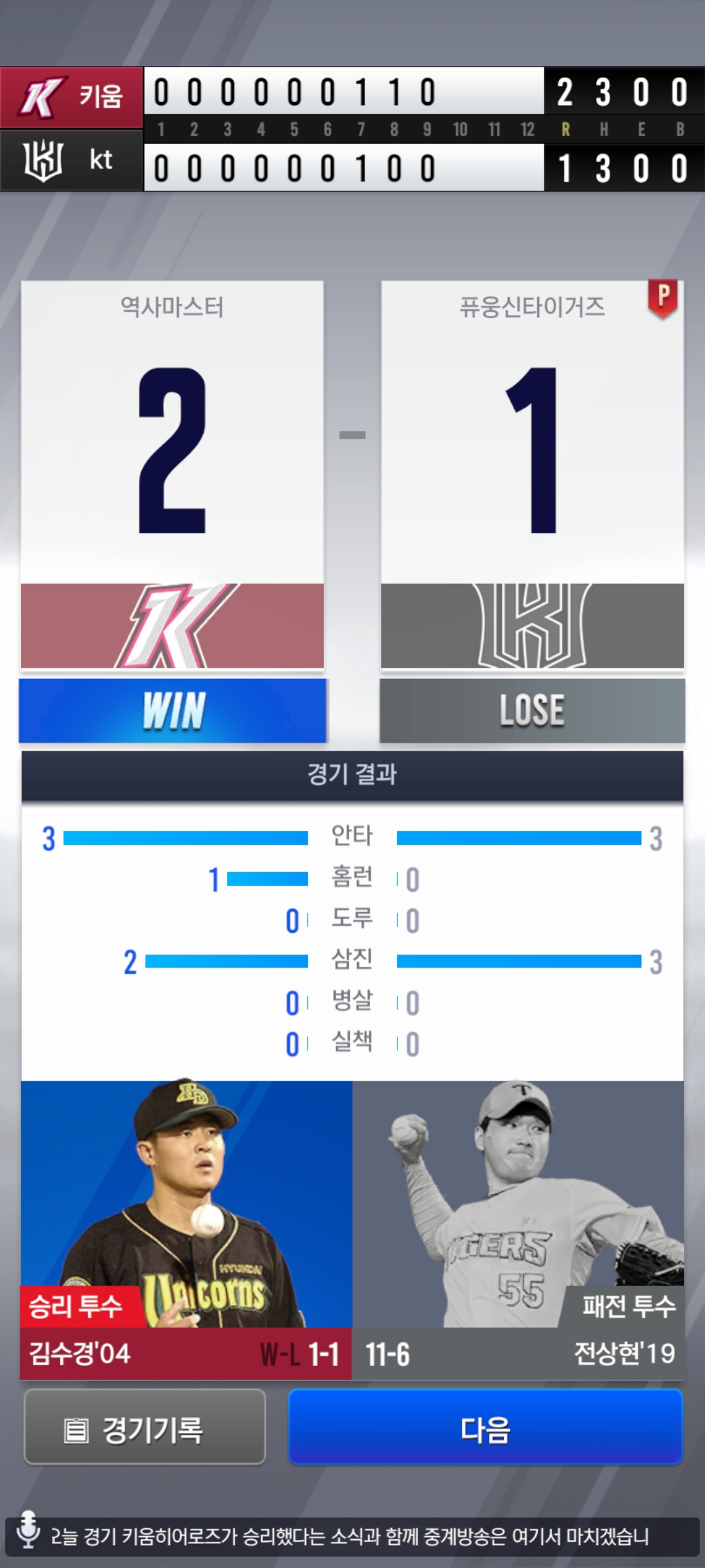 겨우 2아웃 2루로 만들어놓으니까 다시 실투나와서 역전 적시타