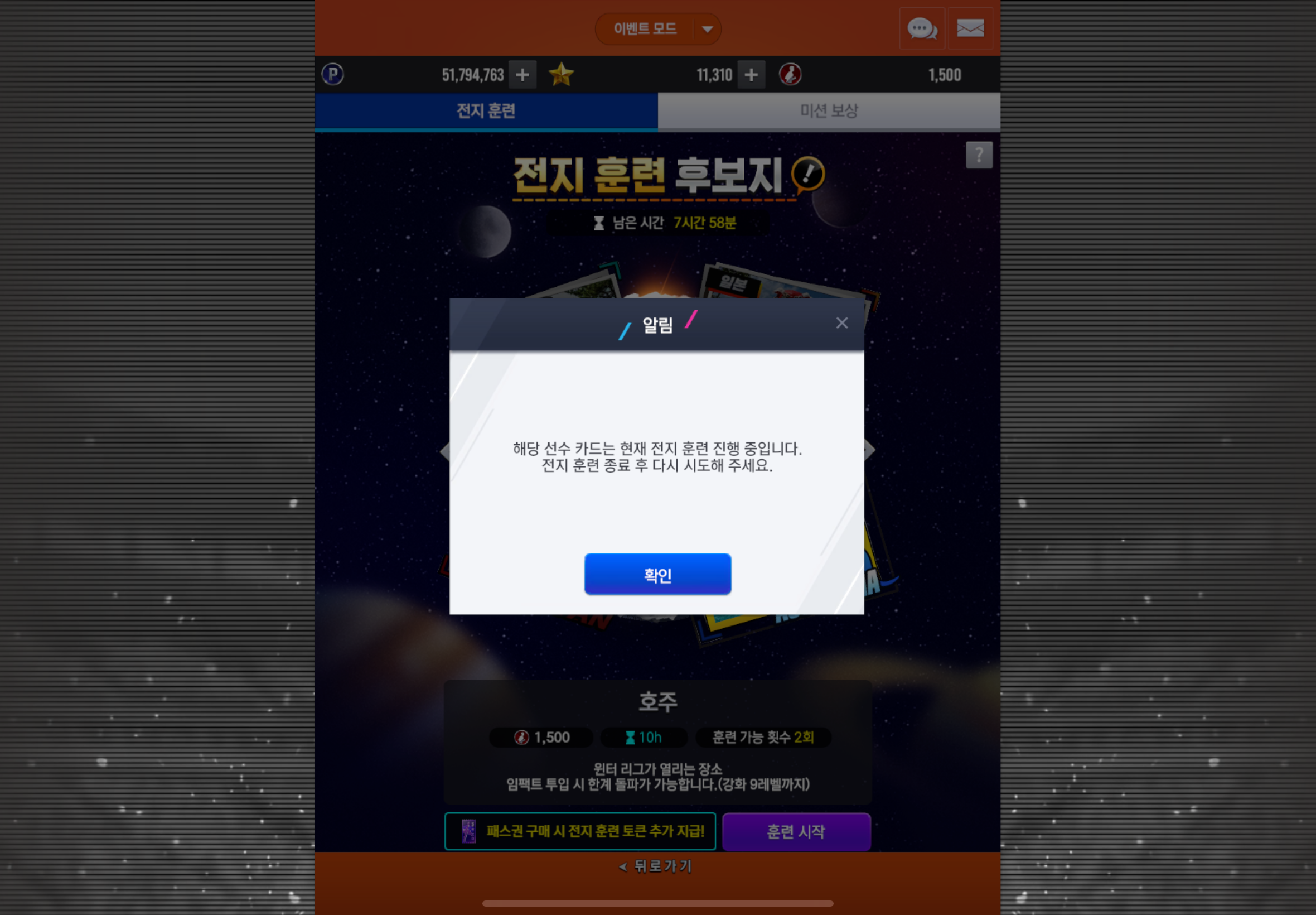 방금 글 올리 유전데 다른 전지훈련(한계돌파)에 페라자 등록하려니 이렇게 뜨네요
