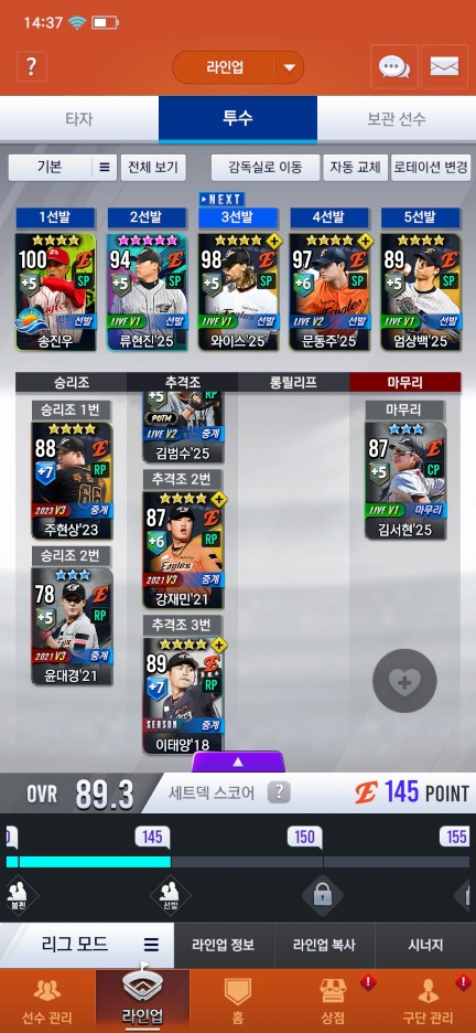 현재 쓰고있는 투수입니다 혹시 불펜 위치 바꿀꺼나 투수 변경할거있으면 말씀좀 부탁드리겠습니다