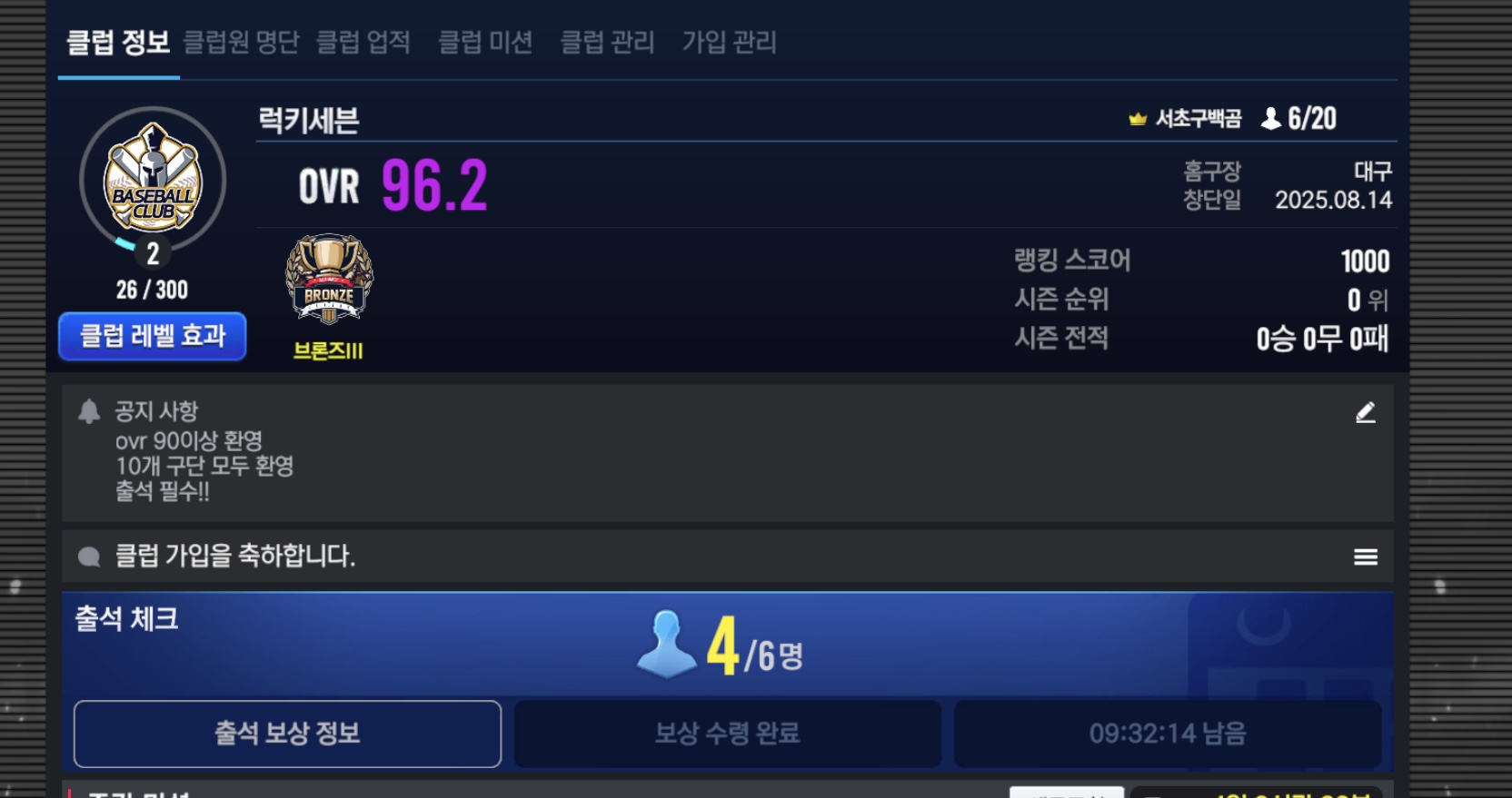 클럽대전 한시즌 4번 미참여 시 강퇴조치입니다.