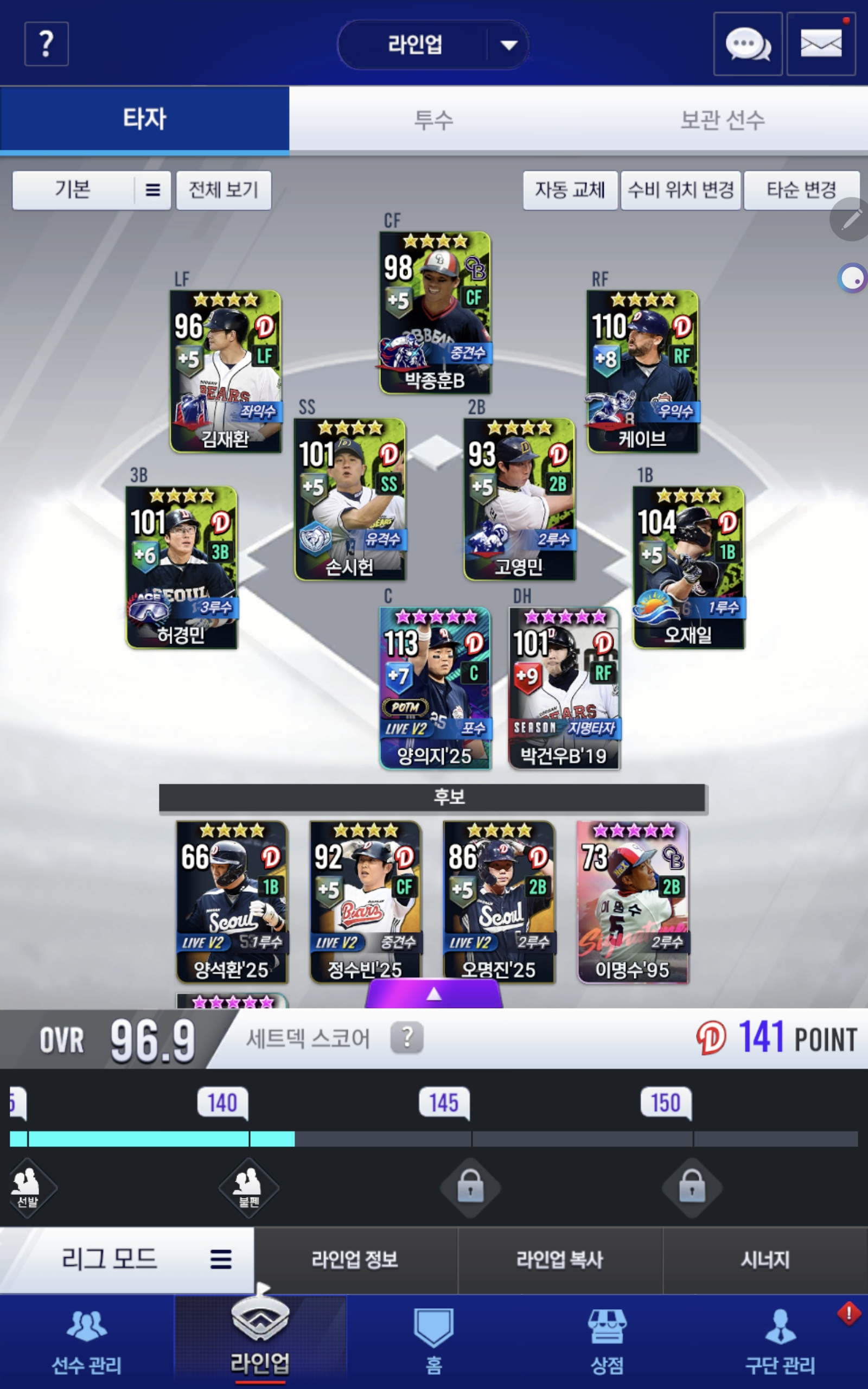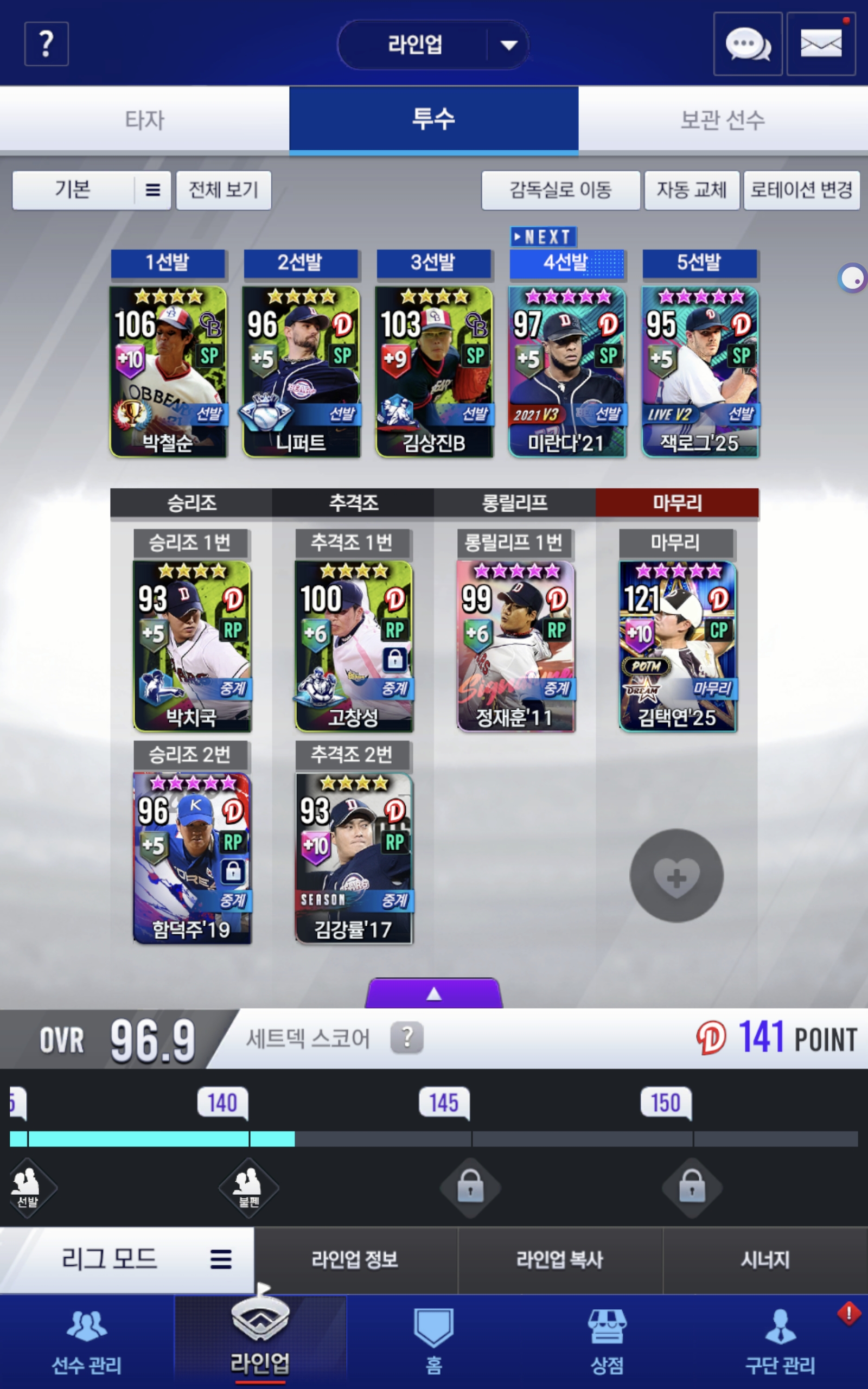 아직도 쓸수있는 김재환 없어서 홈런팩에서 주는 김재환쓰고.. 스텟 높은게 최고야 하며 카드쓰다보니 임팩으로 도배된 팀.. 그나마 김택연 올스타는 팬심으로 키워놨는데.. 실대에서 많이 구진거같구요..