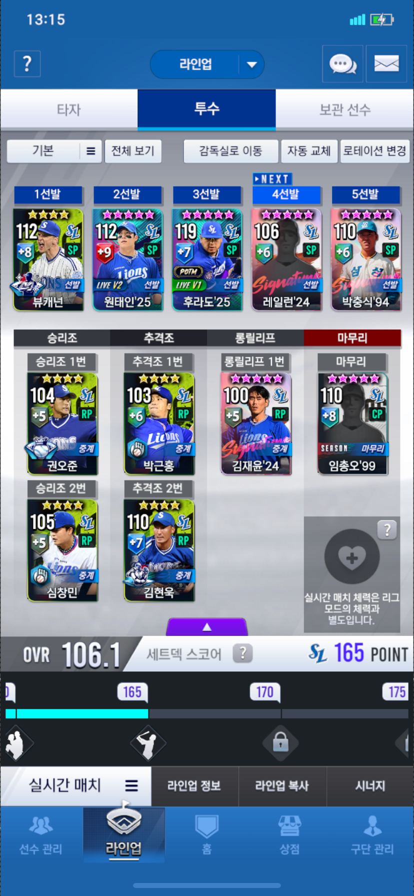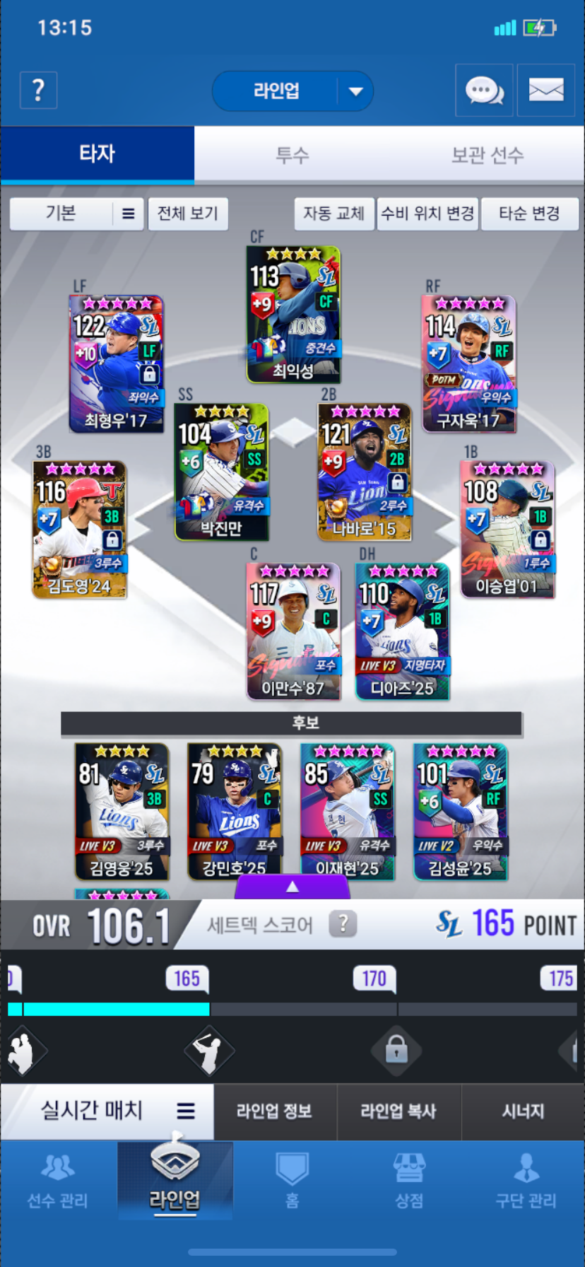 포특 열심히 하는중이고 유격수는 마성의 주자 김상수 있으나 결국 바꿔야할 포지션이라 안키우고 있습니다. 선발이 너무 약한거 같아서 시그 선택팩은 95김상엽할까합니다. 내년에 인카타라 시그를 FA로 할까도 싶구요. 강화도 빡세고 훈련도 빡시네요ㅠ 이제 한 130일차 같습니다. 조언 부탁 드립니다.