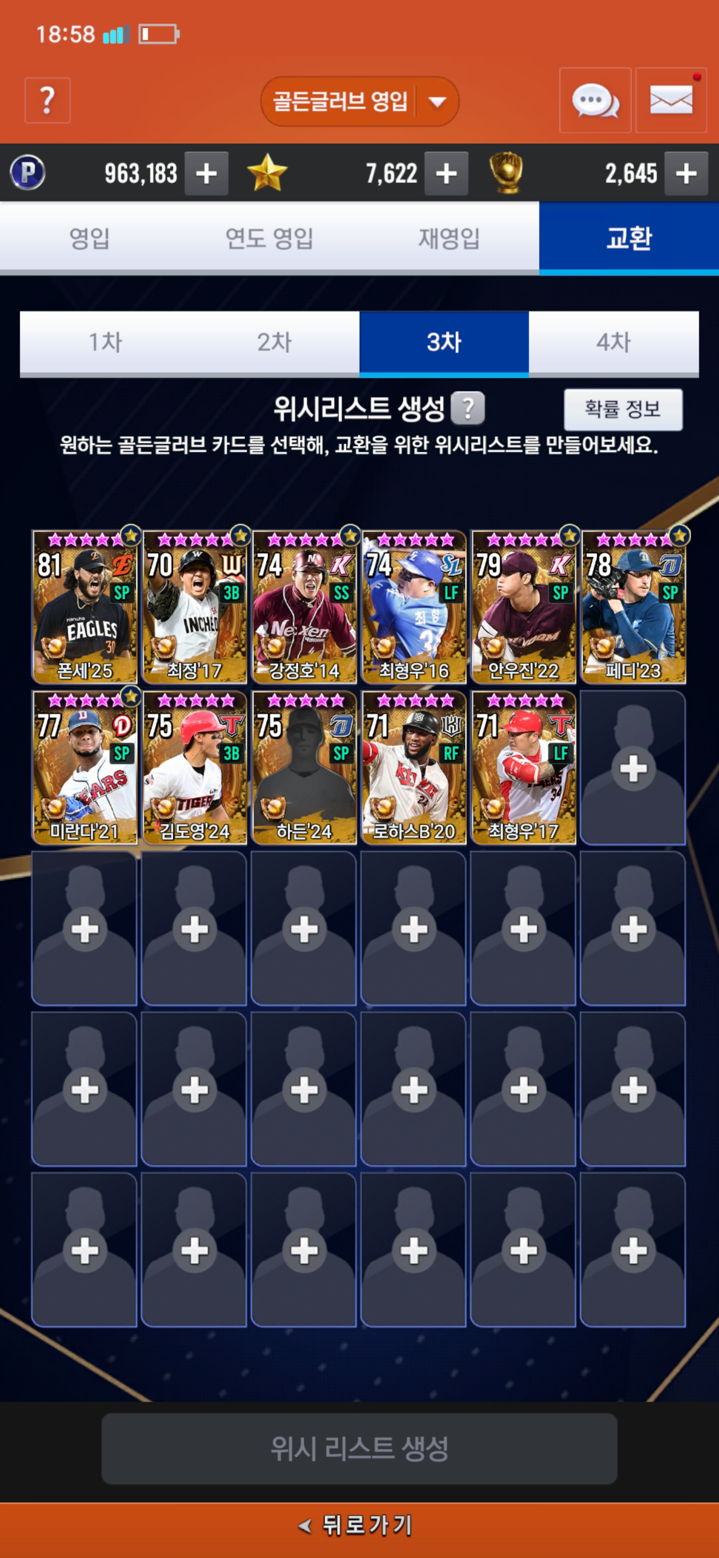 1,2차 교환 다 했습니다. 위시 정해야하는데 솔직히 12시그 류현진이 있어서 류현진도 필요없고 그래서 못정하겠네요. 일단 좋은 선수들 정하긴 했습니다. 하트는 뜨면 각성해서 폰세 계승해줄려고요ㅎㅎ. 아무튼 그래가지고 지금 위시로 뭘 추가해야할지 모르겠습니다. 일단 다른 년도 최정이나 넣을까요?