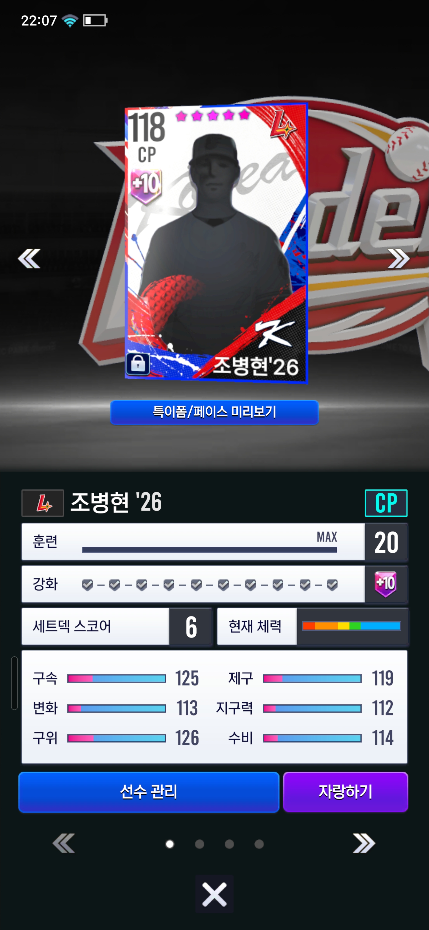 바로 조병현 제작했습니다 물론 올스타 카드보다는 떨어지기는 한데 26 올스타 고려하고 국대 응원하는 마음으로 만들었습니다
