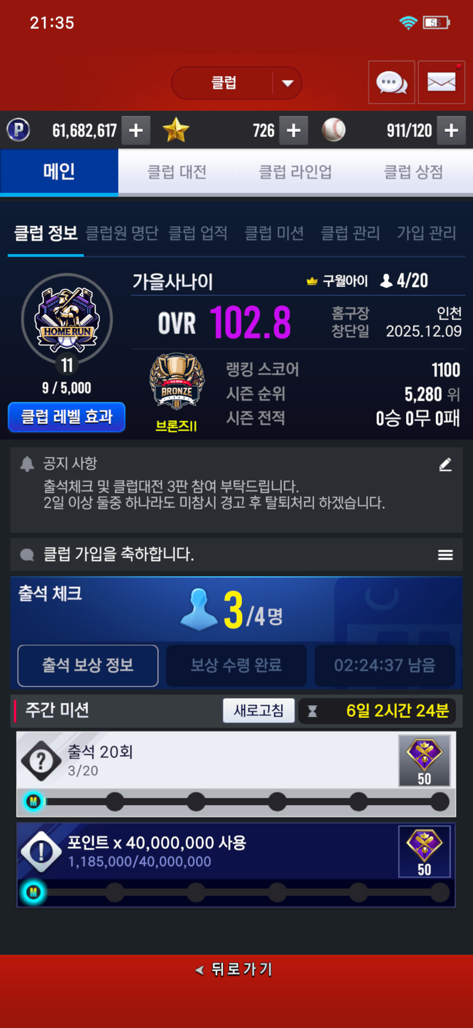 매일 출석 및 클럽 대전 3회 필수