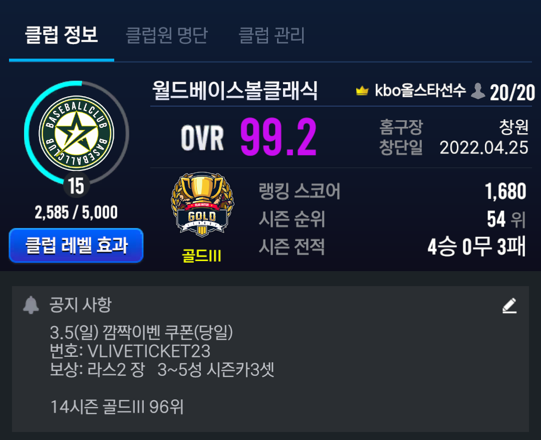 출석, 클럽대전 3판 모두 참여해주실수 있는 오버롤 98이상이신분 한분 모십니다. 댓글로 신청주시면 감사하겠습니다.