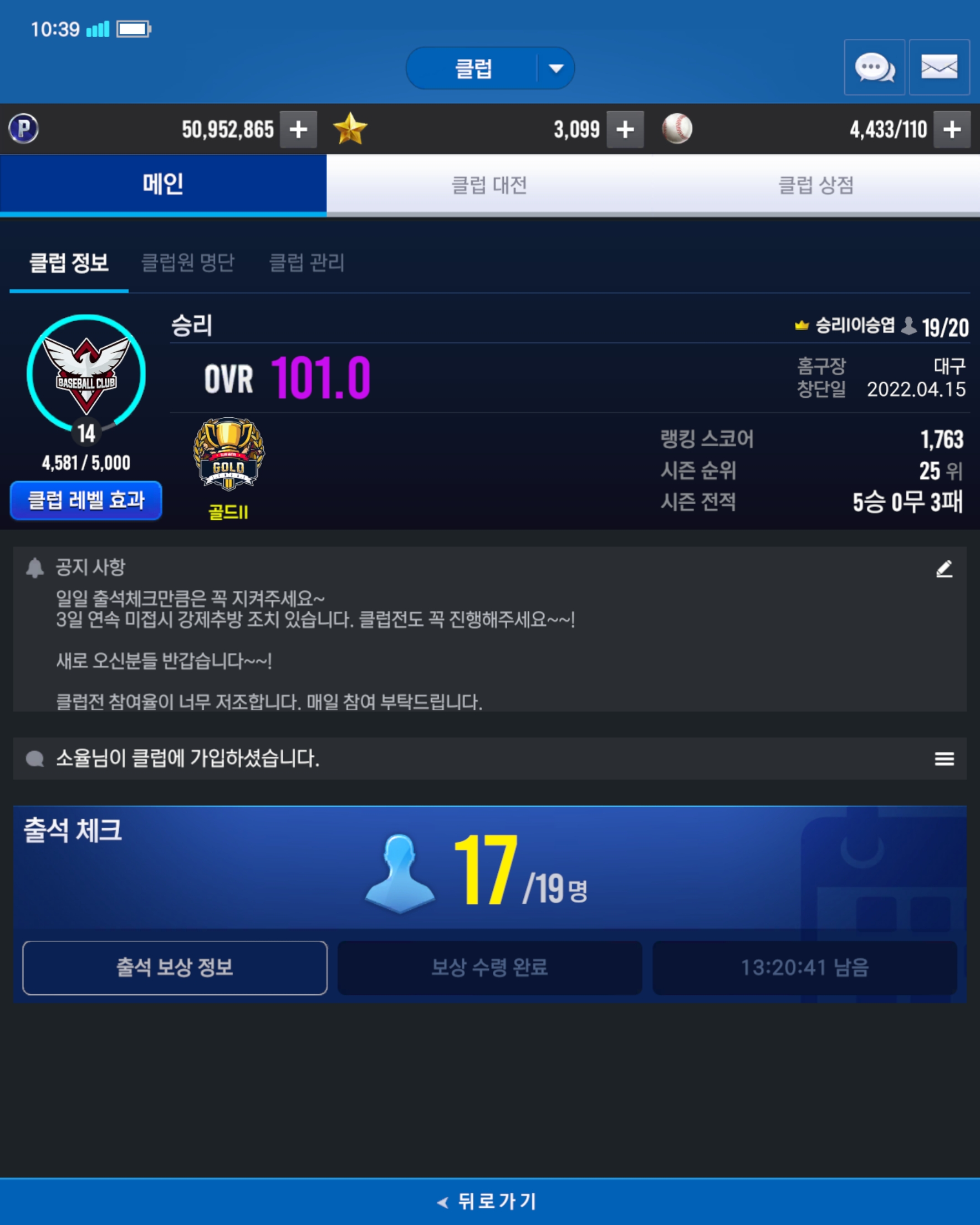 클럽레벨 14(15직전)이며, 클럽 평균 OVR 101입니다. 클럽원분들 참여율 좋으십니다.