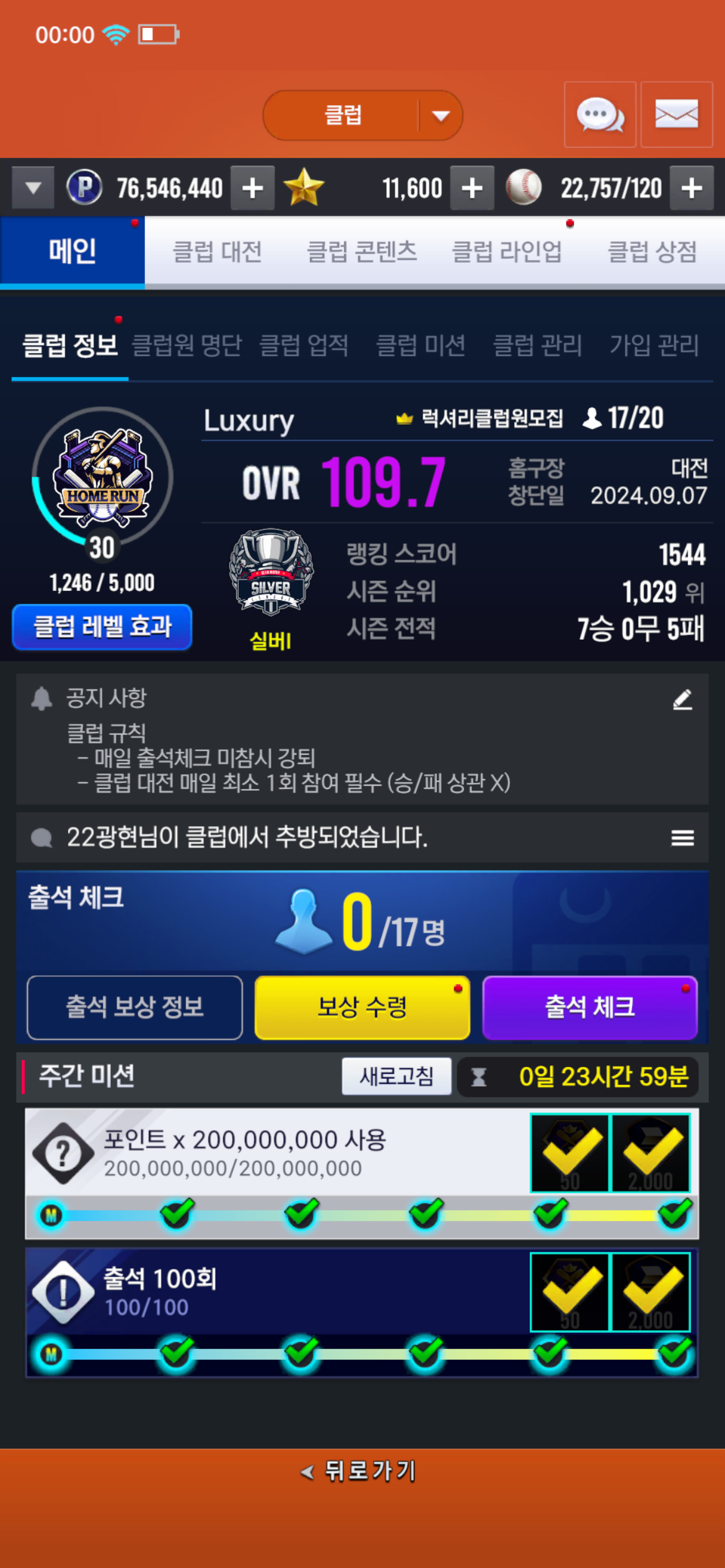 Lv.30 luxury에서 클럽원을 모십니다 기존 출석클➡️리빌딩으로 출석&클전 진행클로 바뀌었습니다 (리빌딩 6일차 리빌딩 기간 클전은 계속 진행예정)